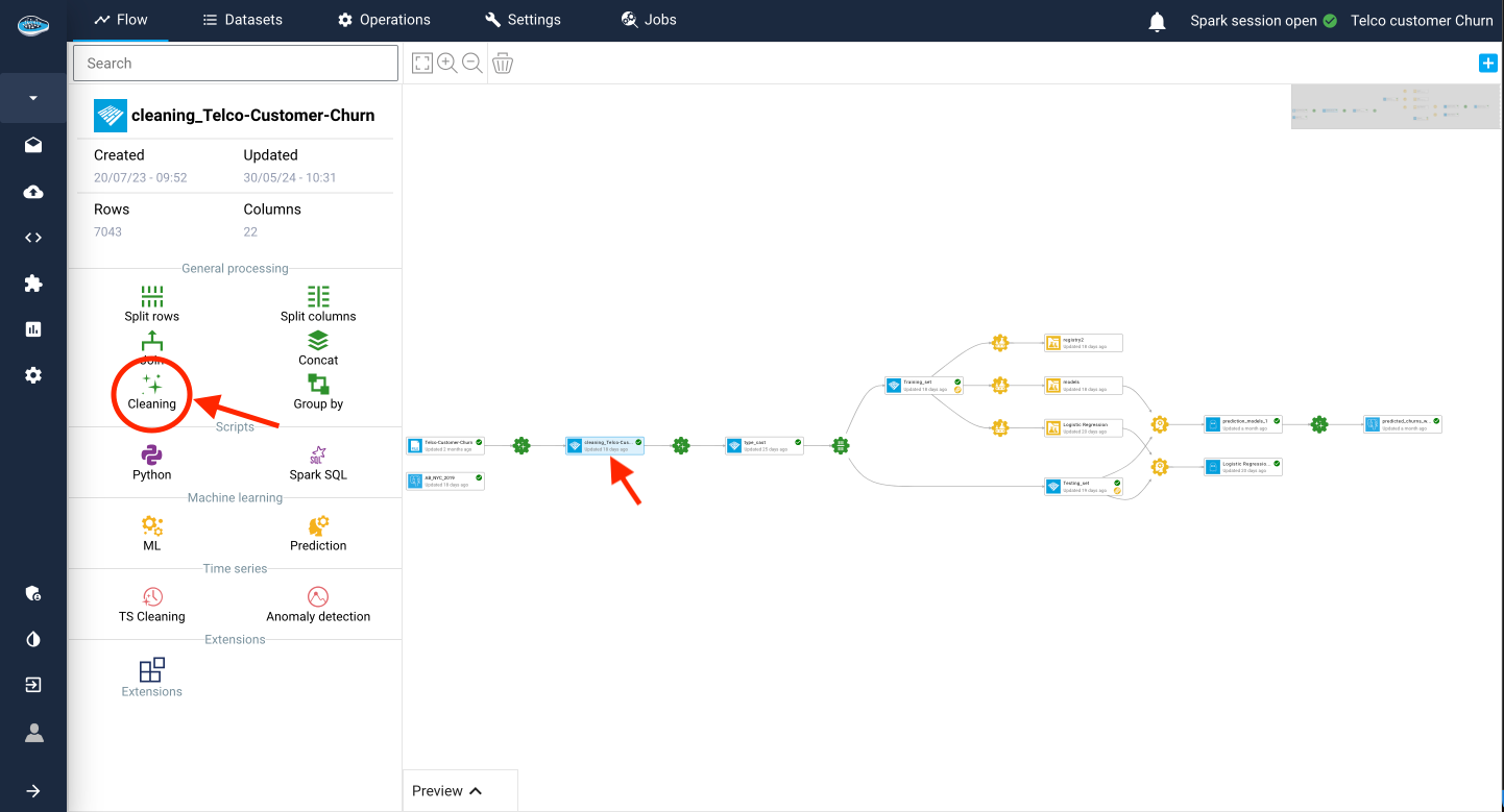 To access this feature, you select the dataset from your project's flow and on the left sidebar, select the Cleaning operation and will appear the Cleaning module interface.
