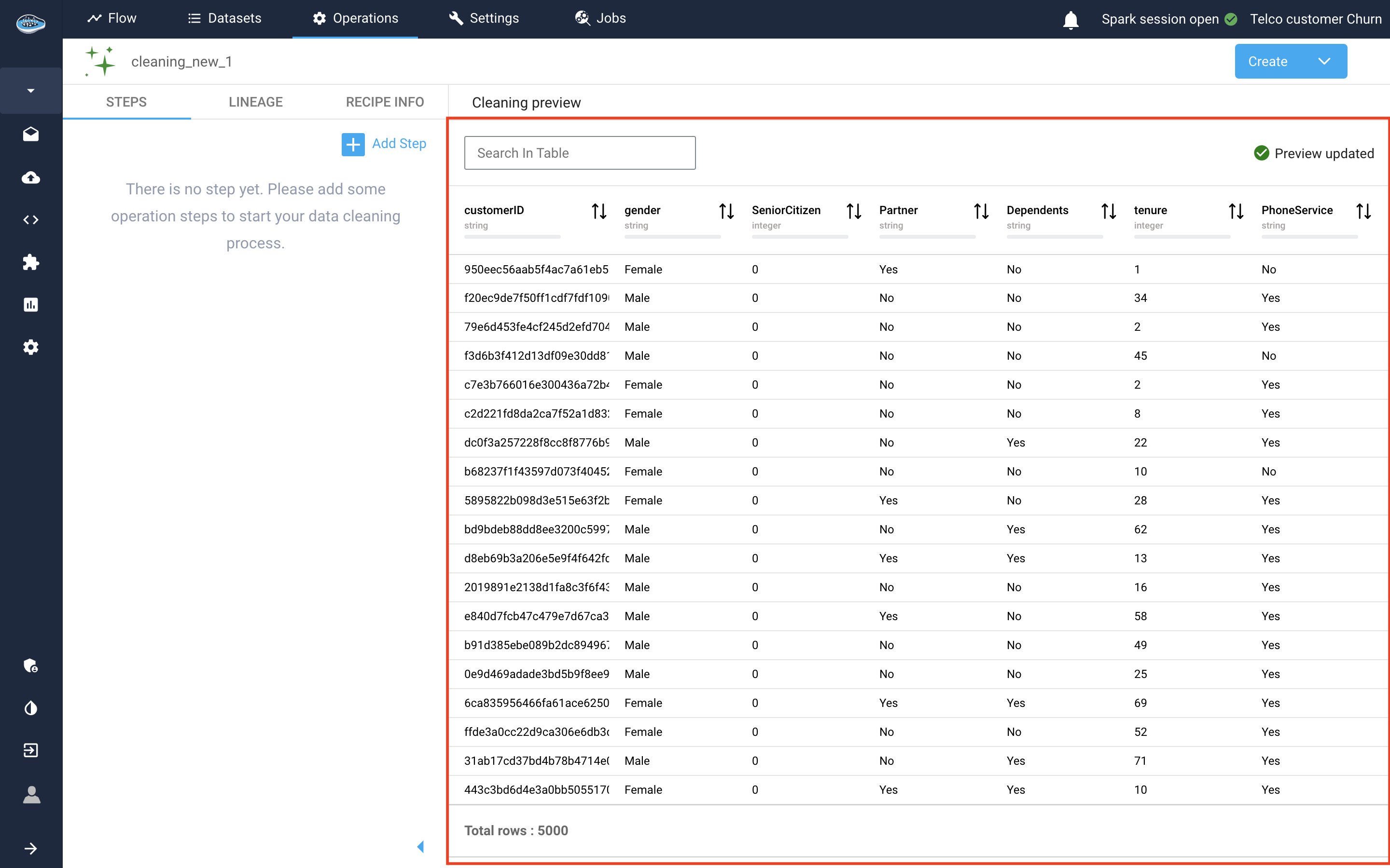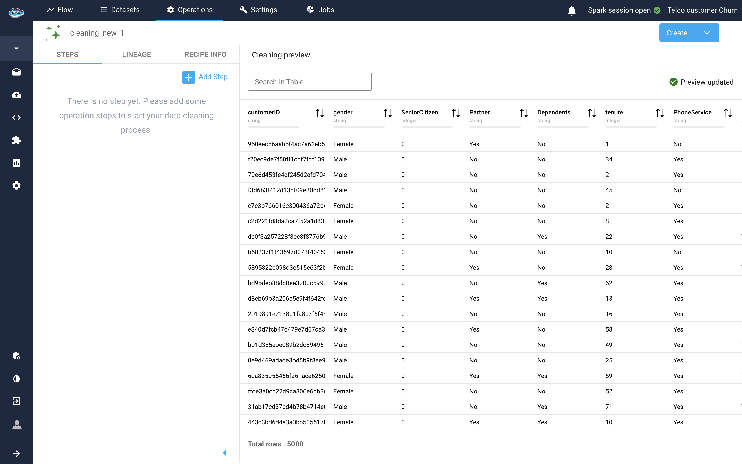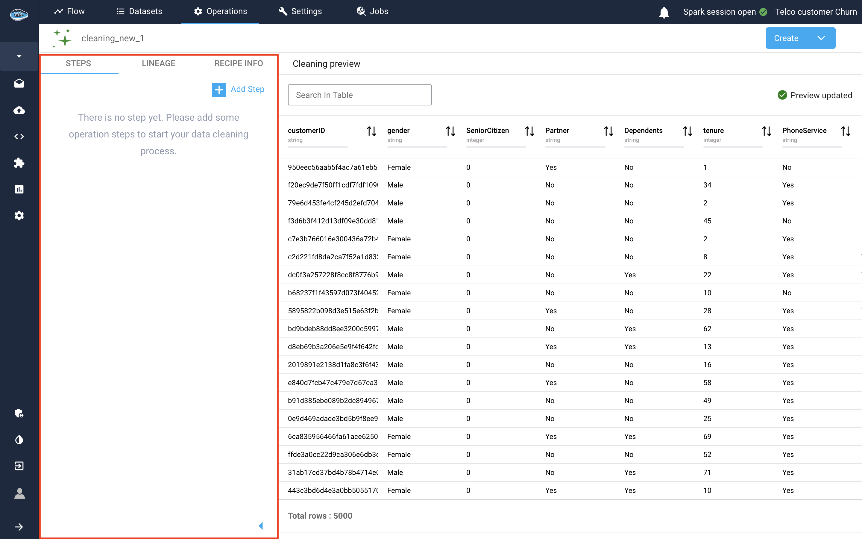 - The right of the screen displays a preview of a sample from the input dataset after applying the series of steps. Any action on the list of transformation steps is directly visible.