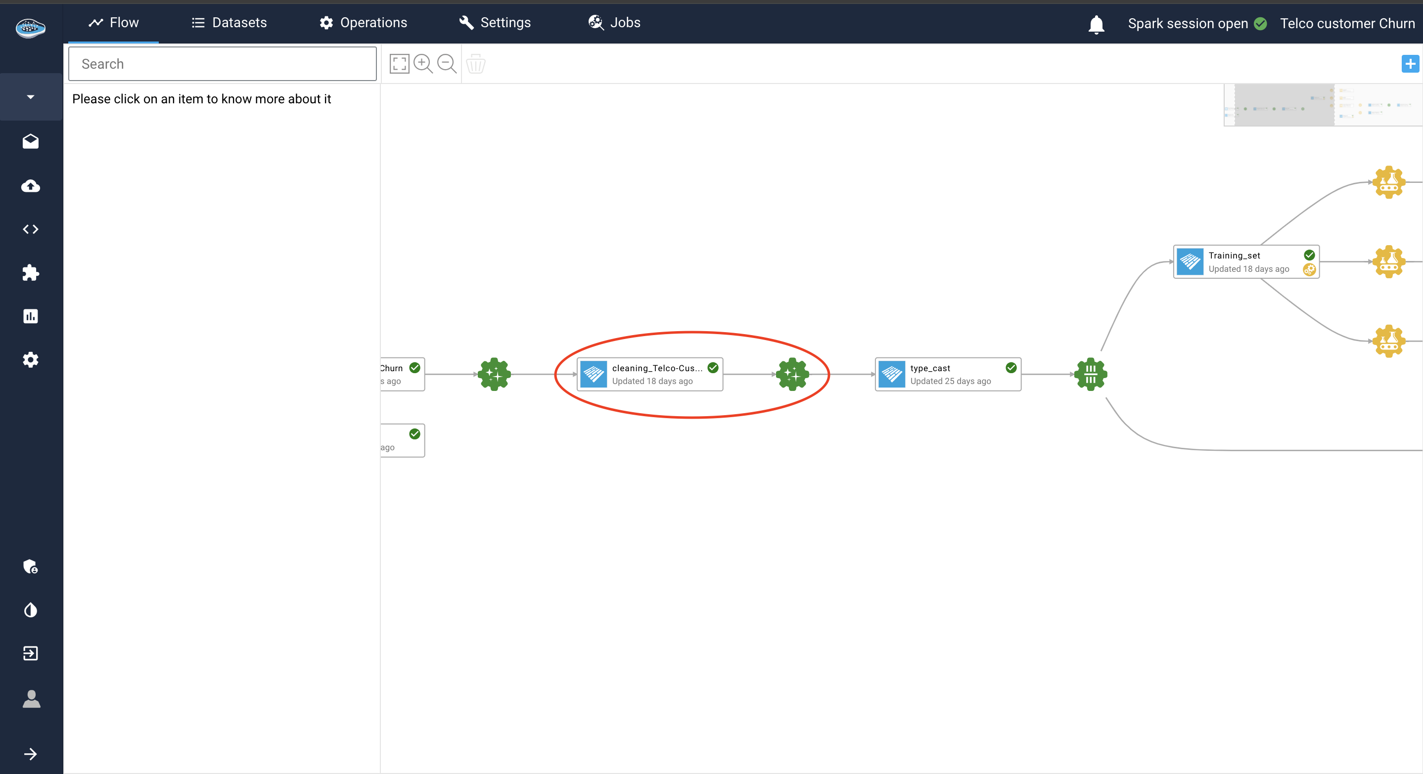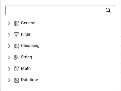 - The left panel regroups a catalog of different transformation steps applied to the input dataset that you can add as many as you want and remove them at anytime.