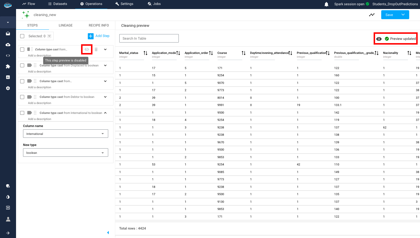 If you want to disable the preview of one of your cleaning steps, you can do it through the icon on the top right of the desired step by simply clicking it and the icon will change to and the preview will automatically be updated.