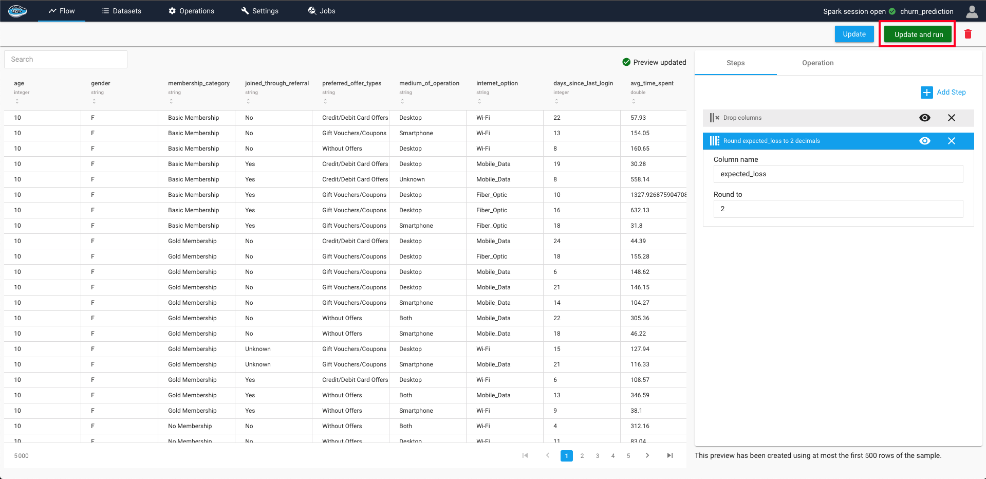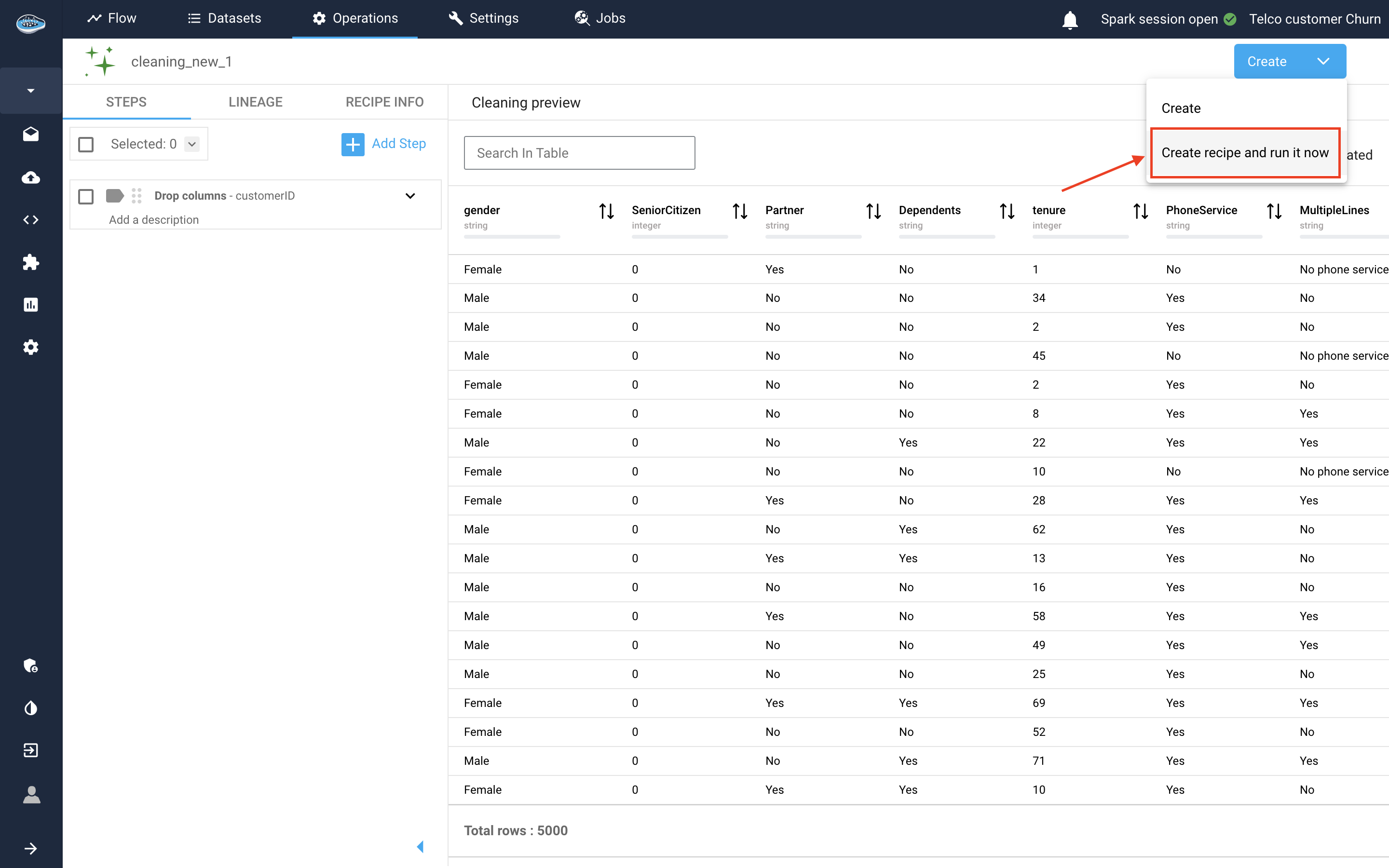 When the preview satisfies you, you just click on the Create recipe and run it now button and a green gear icon linked to the source and output datasets is displayed on your project's flow.