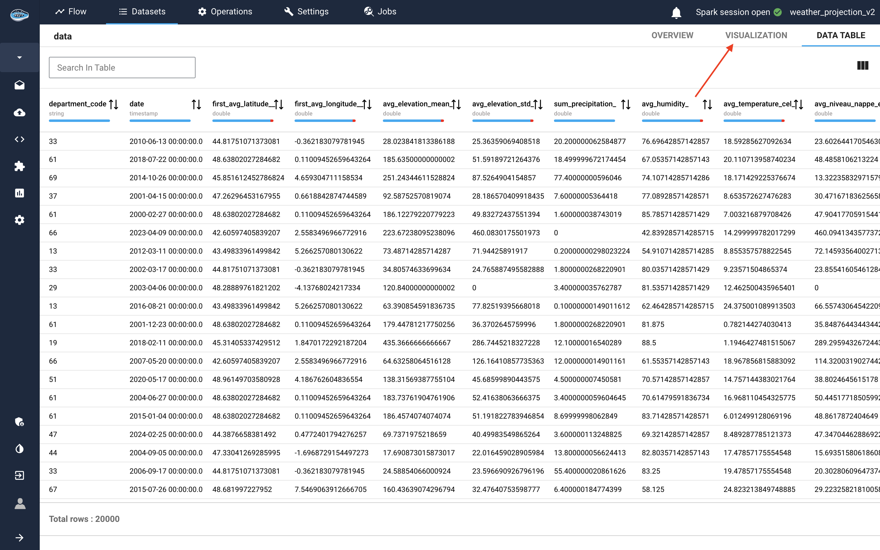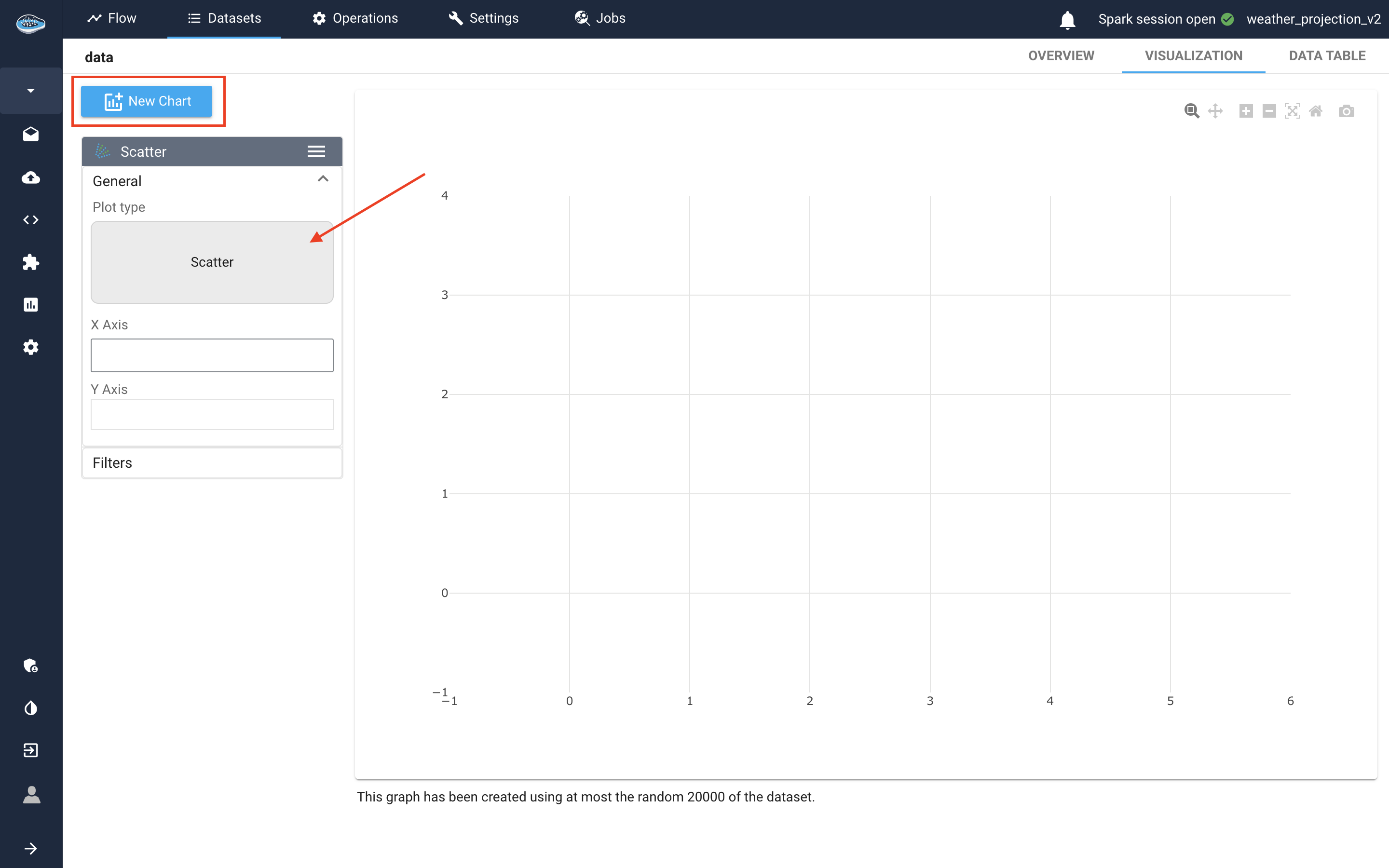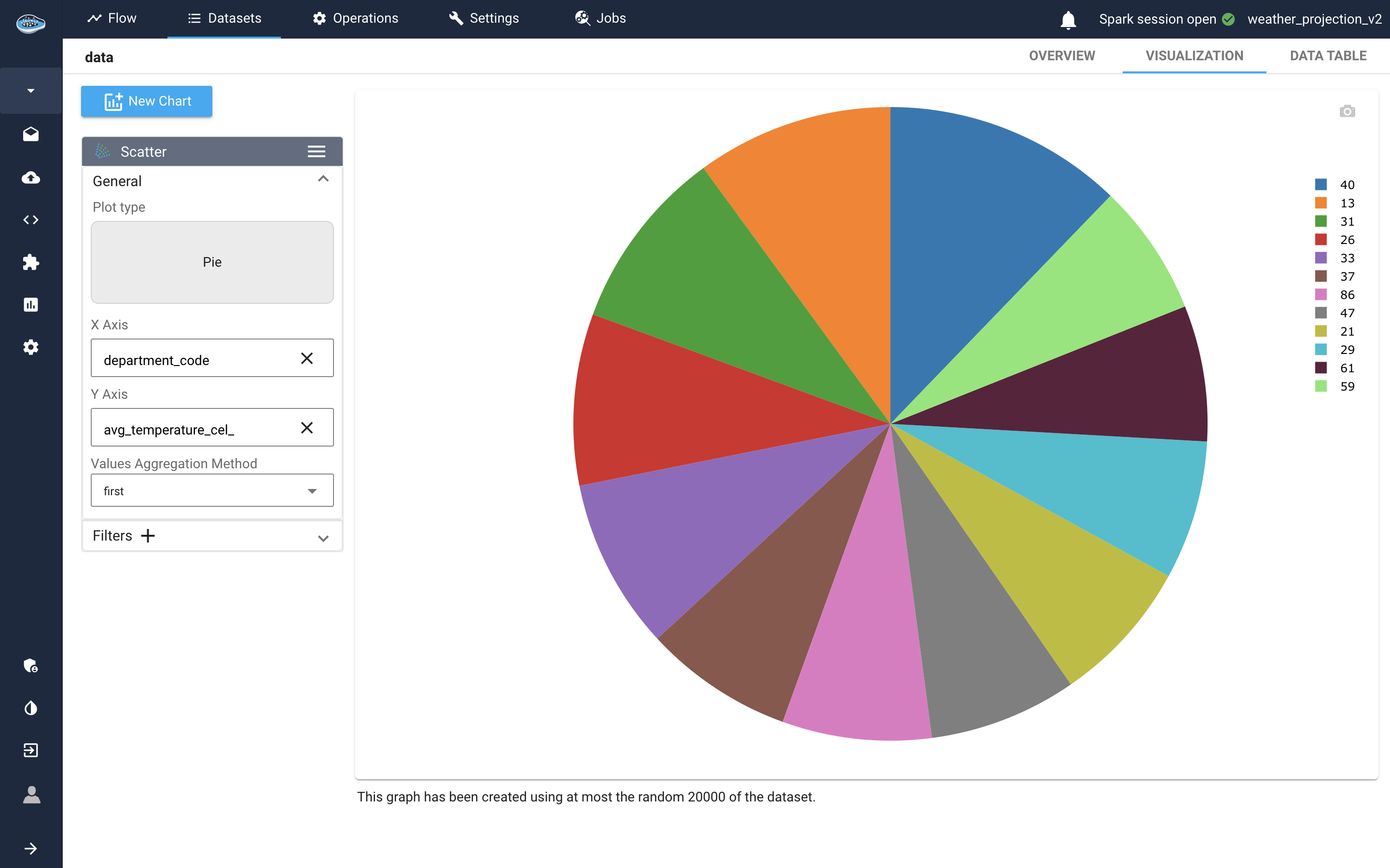 Raw data can be intimidating for most people since it has a complex structure and a huge quantity to analyse. To enhance the comprehension of this data, we provide a catalogue of different types of graphs and charts to add more flexibility to inspect the data. To access to this feature, you just double-click on the desired dataset and when it shows you the data table, you just click on the visualisation tab to begin the visualisation process.