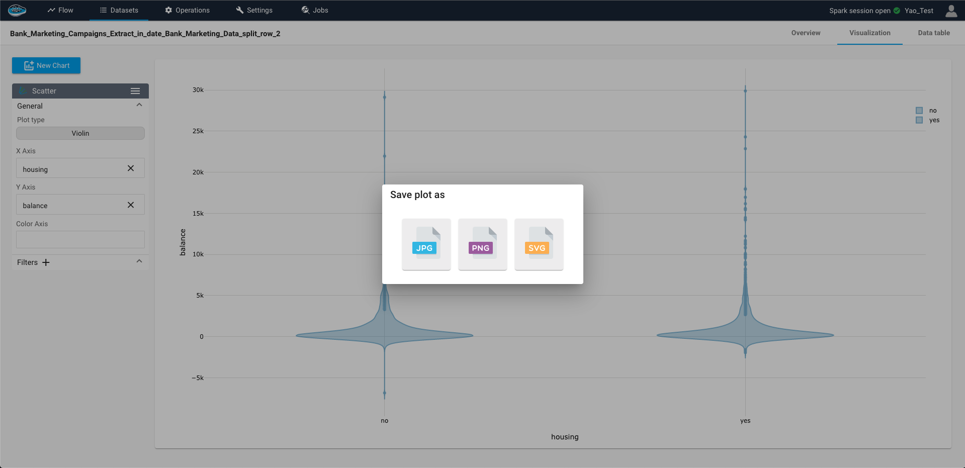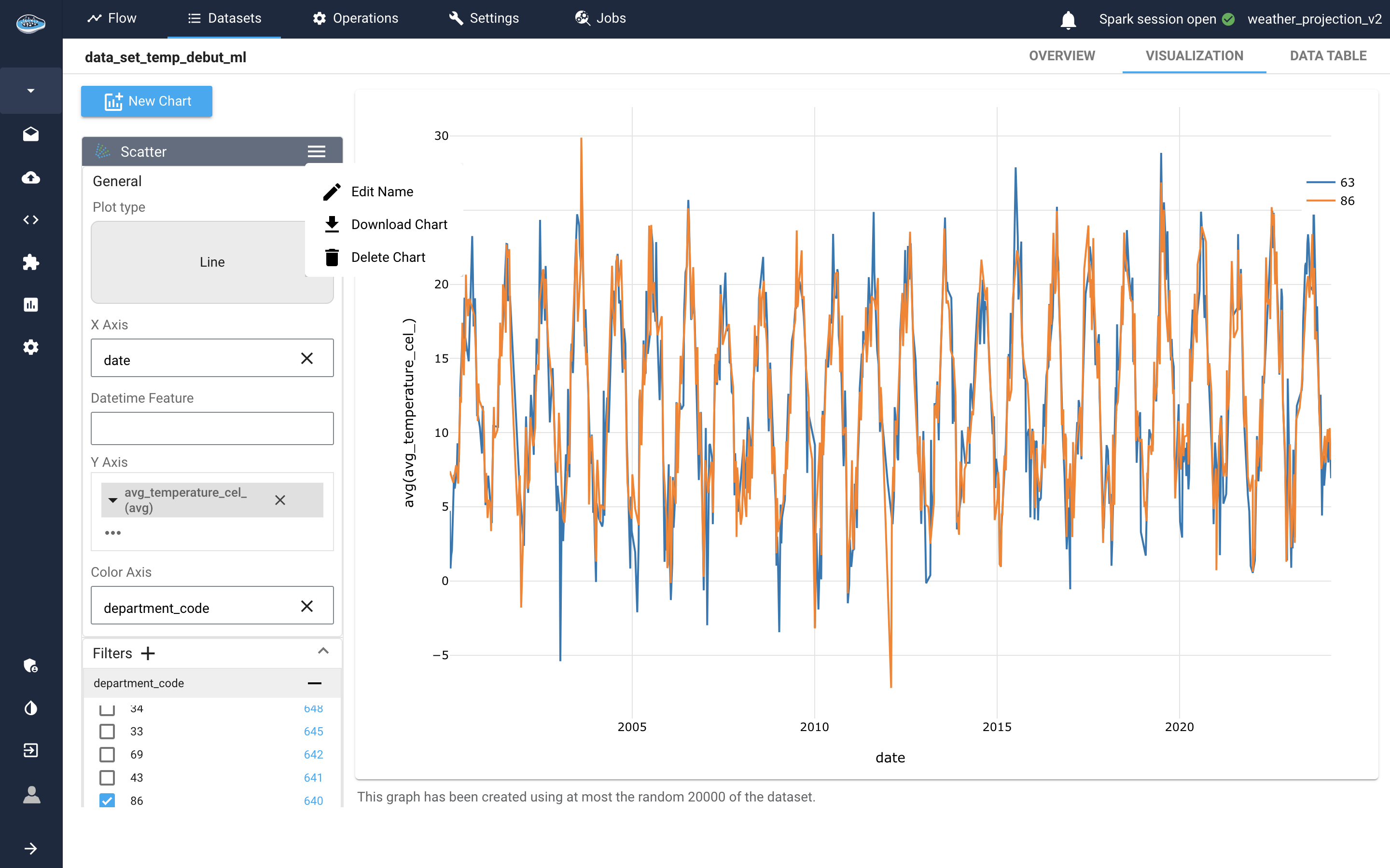 According to the type of graphs, a number of axes on which the user should select the column to represent will be displayed. Adding to that, many settings are available for the user to select to personnalize the chart to his preferences such as filtering the data or changing the color axis among others.