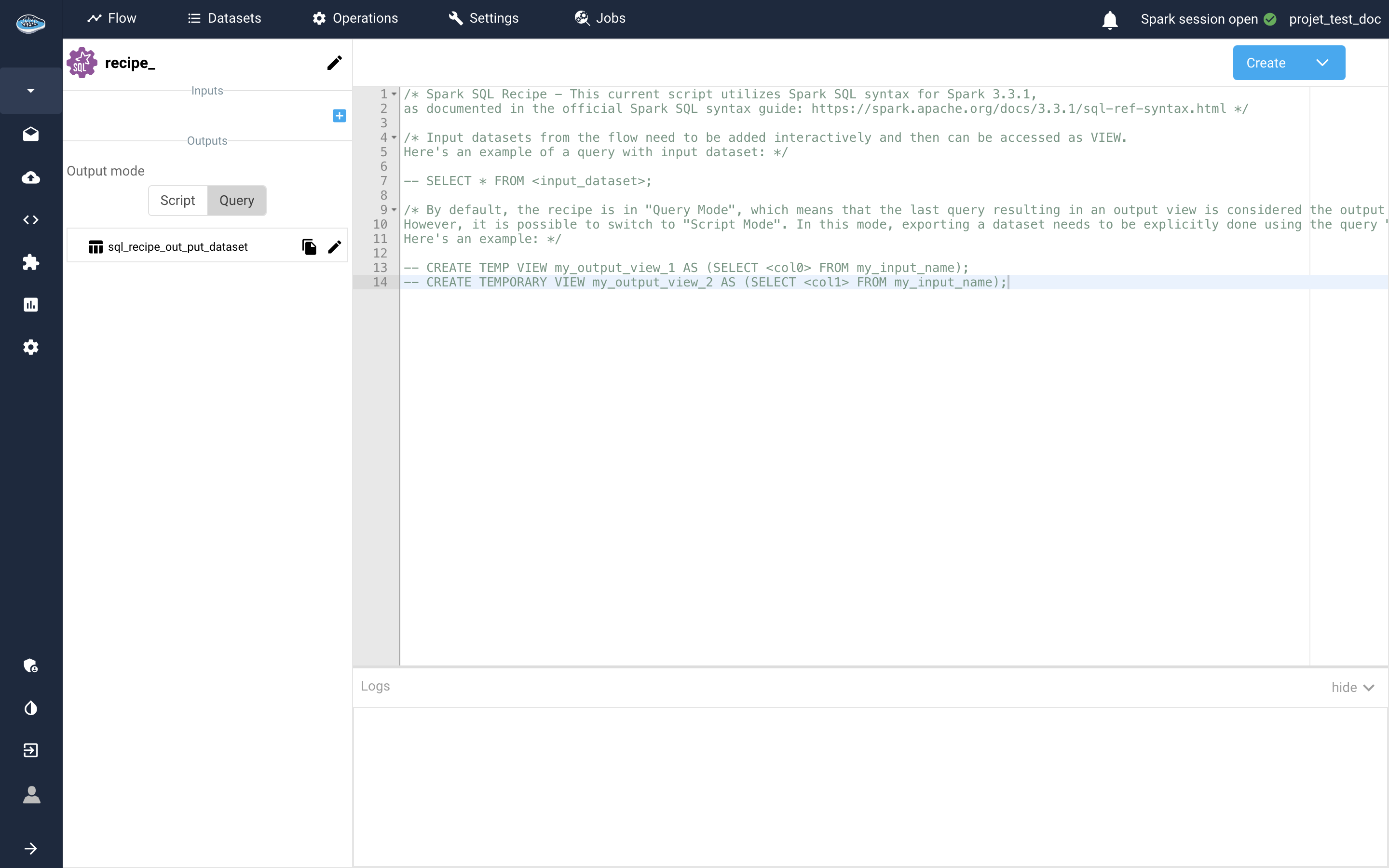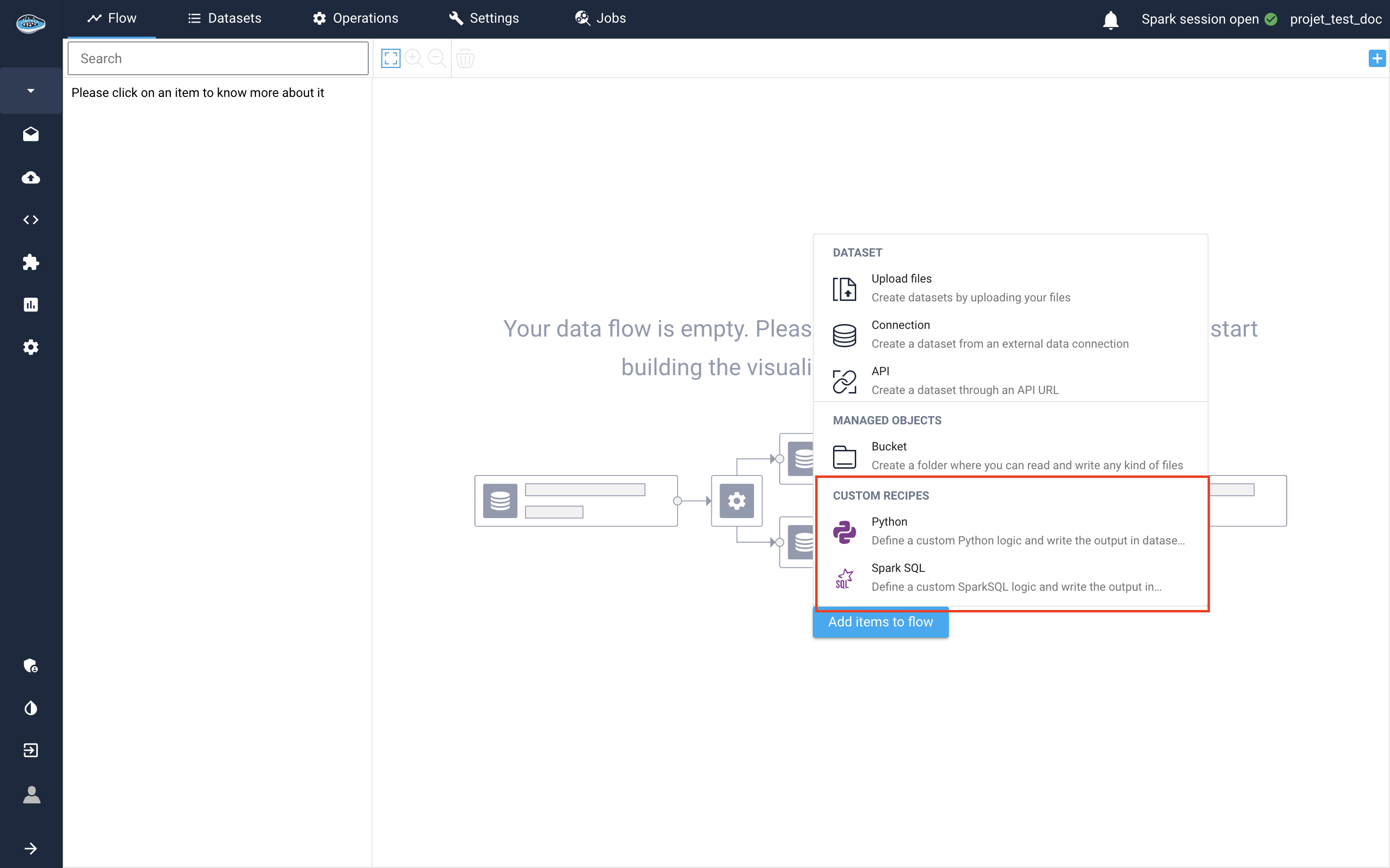 Thanks to our integrated Python and Spark SQL scripts, you can simply code and create your own dataset to be exported onto your project's flow. Simply click the same Import a new dataset button or the little icon on the top right corner and select your preferred programming language, either Spark SQL or Python (other languages will be added in the future stay tuned...), and the programming interface will appear onto the screen.