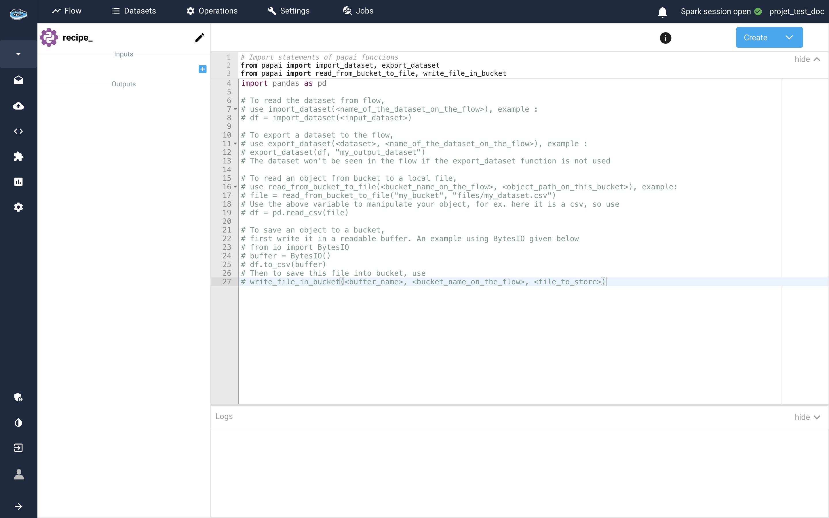 In this interface, you will find a left sidebar with the data inputs and outputs (in this case, you only have outputs). By default, there is only one output but you can add others if needed and you can modify their names. On the right hand side, you have the editor to type in your code. Some lines of codes and some instructions are added by default to help you get started into writing your script correctly.