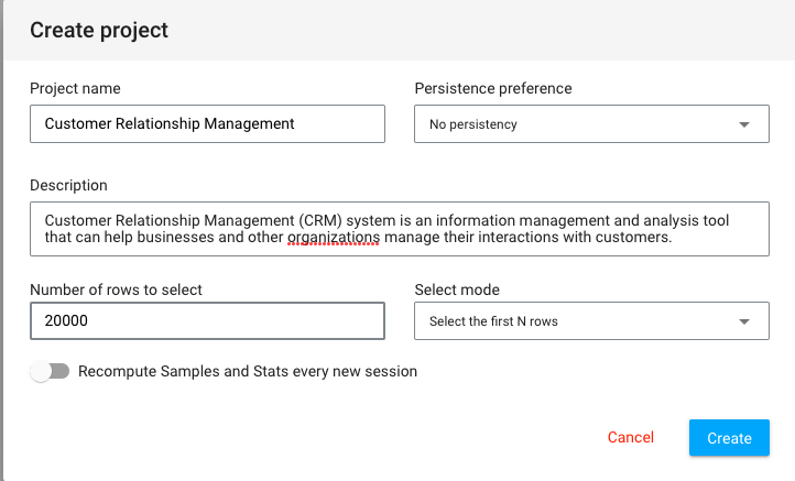 When you log in to papAI, you will be directed to your project homepage, where you can see all your created projects and collaborations. To begin a new project, simply click on the Create project button. This action will open a pop-up window with various settings that need to be filled out. These settings include the project name, a brief description, persistency options, you can also specify the number of samples to be displayed and choose the order selection, such as displaying the first or last N rows, or randomizing the order. Once you have completed filling in the necessary settings, you can finalize the process by clicking on the Create button.