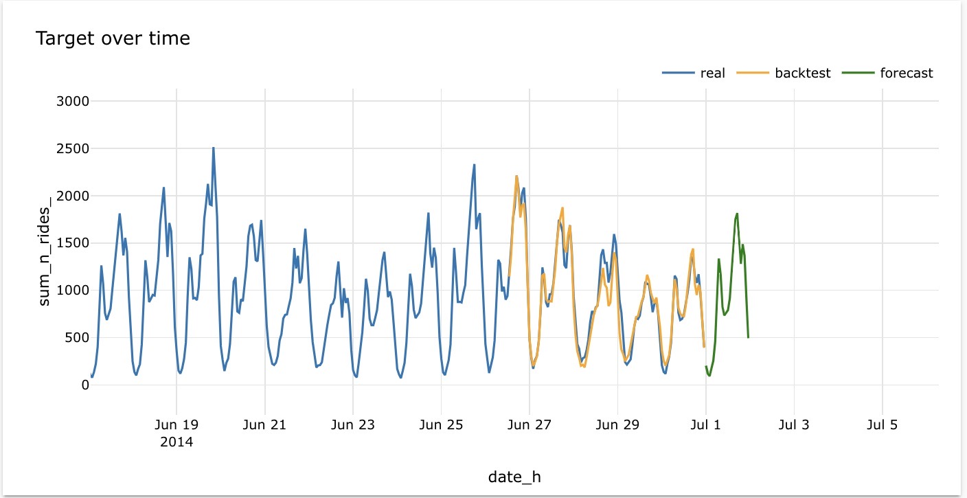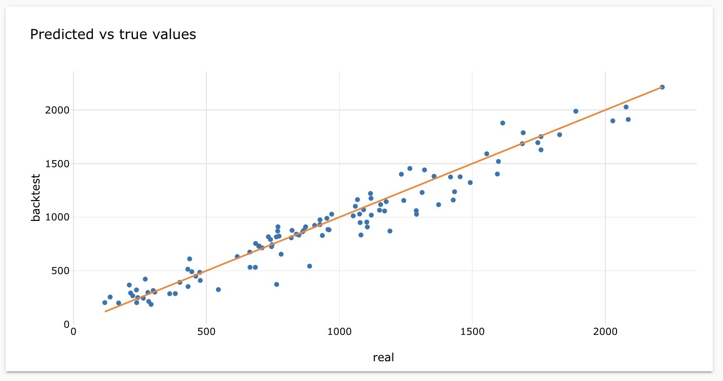 The graph illustrates the model's effective forecasting performance, as the backtest consistently aligns with the actual trend. This indicates that the model performs well in capturing the patterns of the real data.