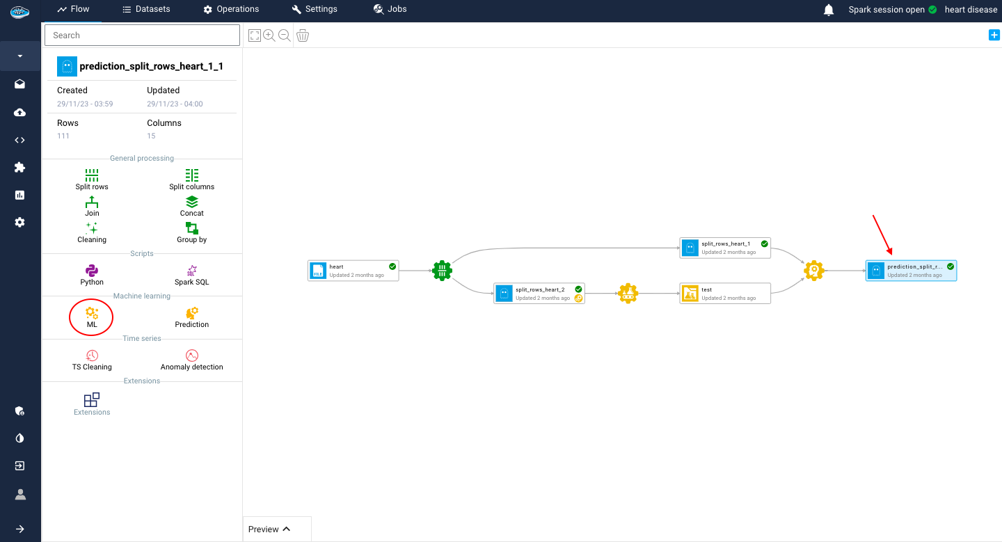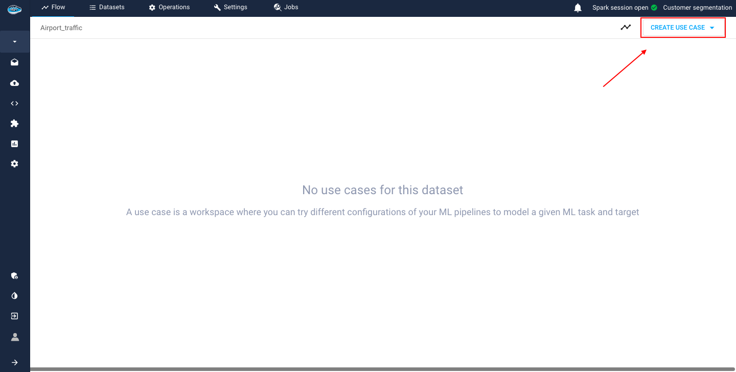 However, before going into the model training, creating a new AutoML use case is a must. To create an AutoML operation, you need to click on your prepared dataset and select the yellow ML gear icon on the left sidebar on your project's Flow.