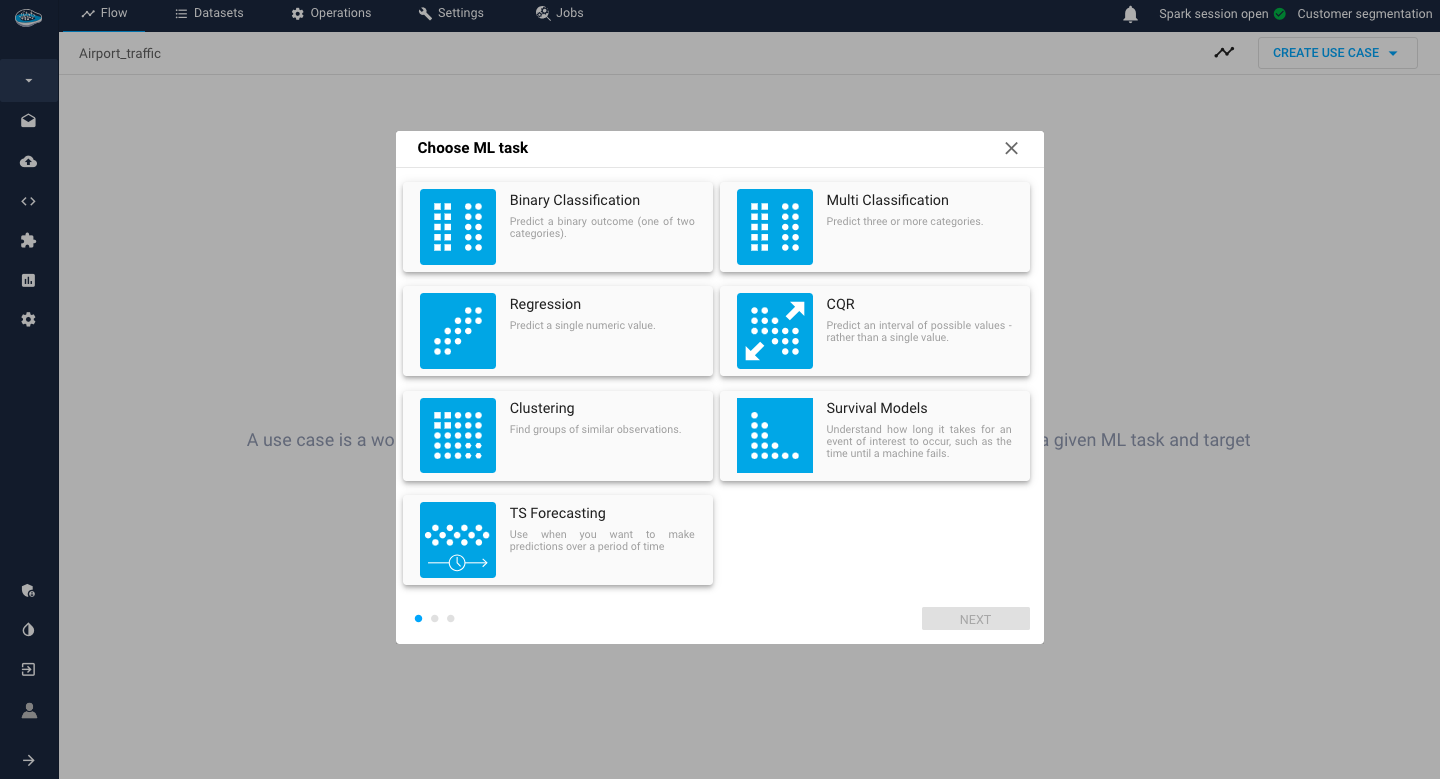 The list of available use case types is the following :Binary Classification, Multi Classification, Regression: to predict a value from a target column that needs to be indicated.Clustering: to detect groups based on some characteristics that the model will automatically find with no target specified.CQR (Conformal Quantile Regression): This specific state-of-the-art type of Regression includes an advanced uncertainty estimation.TS Forecasting: to predict future continuous numerical values like a Regression but related with previously observed values over a period of time.Survival models: a specific type of regression used to estimate the duration time of an event to be occured(such as the death of a patient or an error status of a machine)